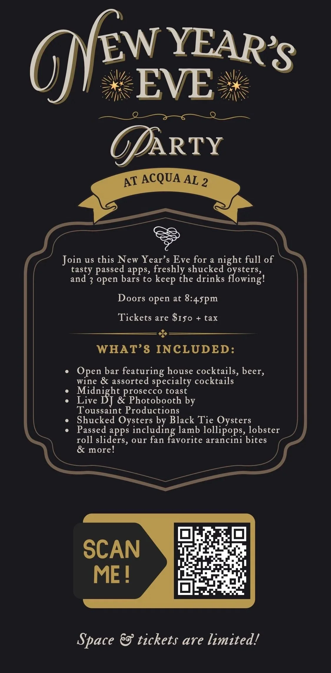 Join us this New Year’s Eve for a night full oftasty passed apps, freshly shucked oysters, and 3 open bars t0 keep the drinks flowing!